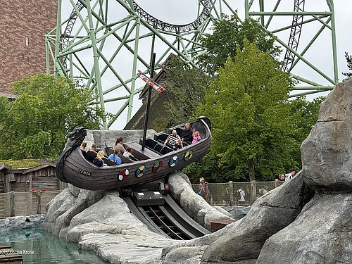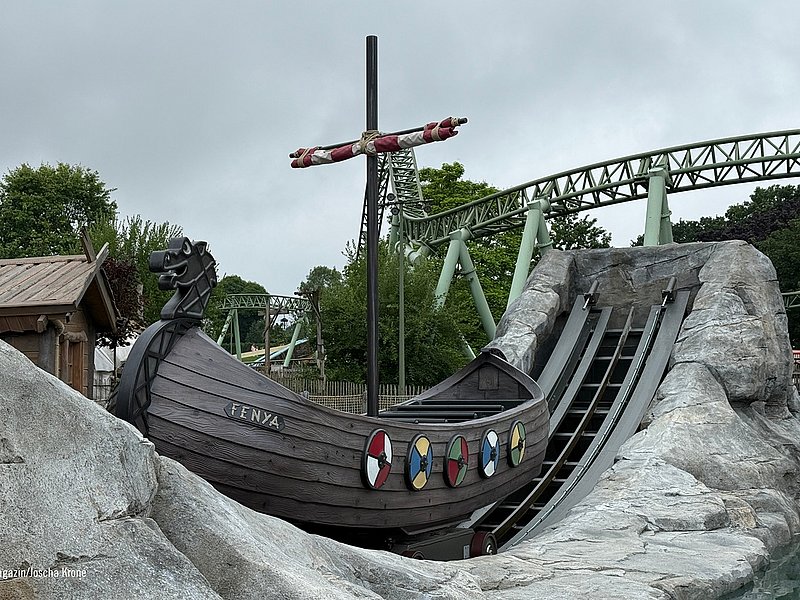 The park has also gone to great lengths with the thematic staging. The ride features ground-level boarding — directly surrounded by a large water basin and by rocky structures reminiscent of Scandinavian fjord landscapes. This elaborate design required a specially engineered foundation, in some areas over three meters deep, to protect the ride’s structure from the surrounding water. At the same time, the lowered construction provides a large barrier-free access. As night falls, integrated lighting embedded in the rocks brings the setting to life and highlights the Nordic atmosphere of the attraction.